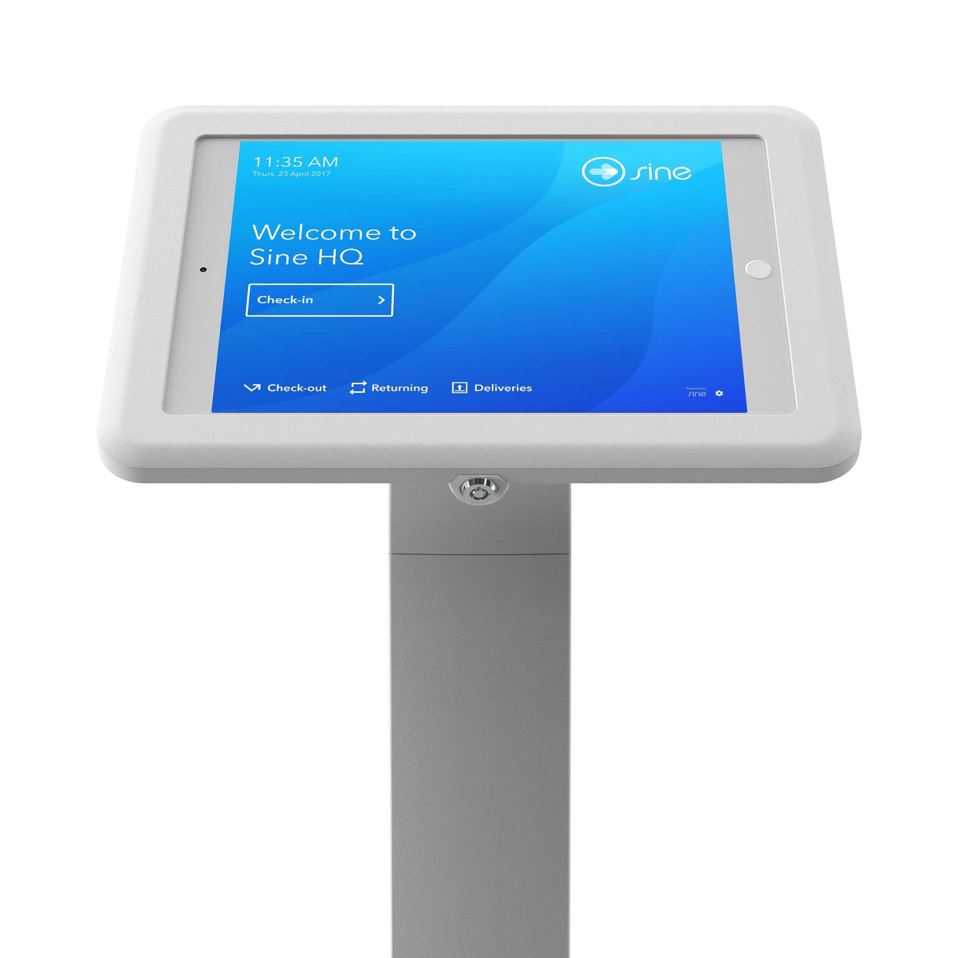The Sine Floor stand is a versatile iPad floor stand that provides an easy viewing area where there is no desk. Boasting a lock, a heavy-duty metal face-plate and a durable ABS plastic case designed to withstand even the toughest commercial environment, they create a secure yet seamless and modern stand suitable for most situations. This floor stand allows for internal cable management and has 2 optional viewing orientations.